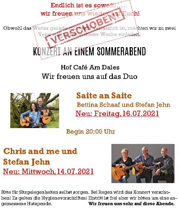 Am 16.07.2021 ab 20.00 Uhr besuchen Bettina Schaaf & Stefan Jehn als Duo „Saite an Saite“ das Café am Dales.